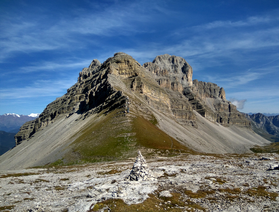 el macizo di Brenta está formado por caliza dolomítica (descubierta por Dolomeu en 1789: caliza con alto contenido en magnesio) / el karst es el paisaje resultante del agrietamiento y desplome de las montañas de caliza, desgaste producido por la acción de hielo y agua sobre la roca soluble (el karst también se da en otros materiales solubles, como el yeso) / sin embargo, el macizo de Adamello, al norte, está formado por granito tonalita. por eso los desmorones que también hay allí no tienen nada que ver con el karst sino con la acción de los glaciares.