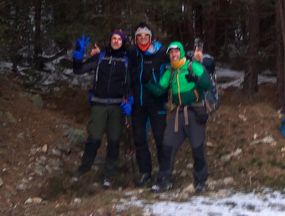 mucho frío, viento y niebla en todo el recorrido. / en Pico del Oso más complicado aún porque había grandes pedrolos muy resbaladizos… peligrosillo. / Ru se despistó en esta parte (culpaaaable) y perdimos la ruta en el punto más difícil, perdimos 45 minutos. / todos nos callamos para no empeorar las cosas pero todos estábamos algo agobiados, porque el tiempo se nos echaba encima, hacía mucho frío y no encontrábamos el camino. / A las 17 h retomamos la buena dirección, dejamos el tercer pico (La Pinareja) y encontramos una senda que nos permitió dejar los pedregales helados y relajarnos bastante. / bajamos haciendo el jabalí, monte a través pero por terreno bastante sencillo de arbustos y bosque (sin pedregal, menos mal) hasta encontrar la ansiada pista forestal. / llegamos a la pista a las 18 h, cachondeo y bufidos, y por fin pudimos comer. / salimos 30′ más tarde con bastante frío en el cuerpo. / la bajada por la ancha pista fue interesante: se fue yendo la luz despacio, luego vimos las estrellas (Orión nuevamente) y encendimos los frontales. / bajamos a un ritmo espectacular, a una media de 5,5 km por hora. / llegamos a las 20.30h.