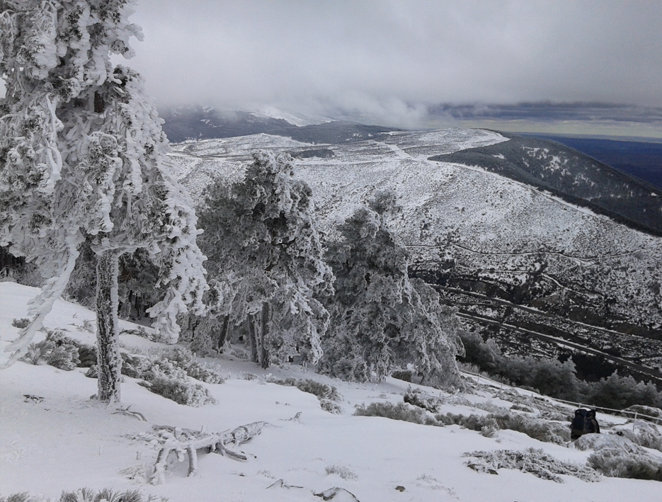 dura ruta samura. huyendo de las tropas de Mordor que se agolpaban en las estaciones de esquí, llegamos al pueblo Puerto de Somosierra. muchísima nieve, pero teníamos los crampones. cuando empezamos la gran y dura subida al pico Tres Provincias, una pareja nos avisó que se habían rajado por el mal tiempo y efectivamente, había una niebla y una ventisca brutales allá arriba. en la subida se me ocurrió la idea de hacerme fotos arriba sólo con la recién estrenada camiseta samura, saliendo en la lejanía desde la niebla y el hielo. samuro Rupertu intentó disuadirme sin resultados, por supuesto. después de la viril hazaña, suficientemente narrada en las crónicas samuras y cantada por los bardos y poetastros, parecía que las manos se me iban a caer a cachos, extremadamente rojas en consecuencia a los 8 grados bajo cero de sensación térmica.
